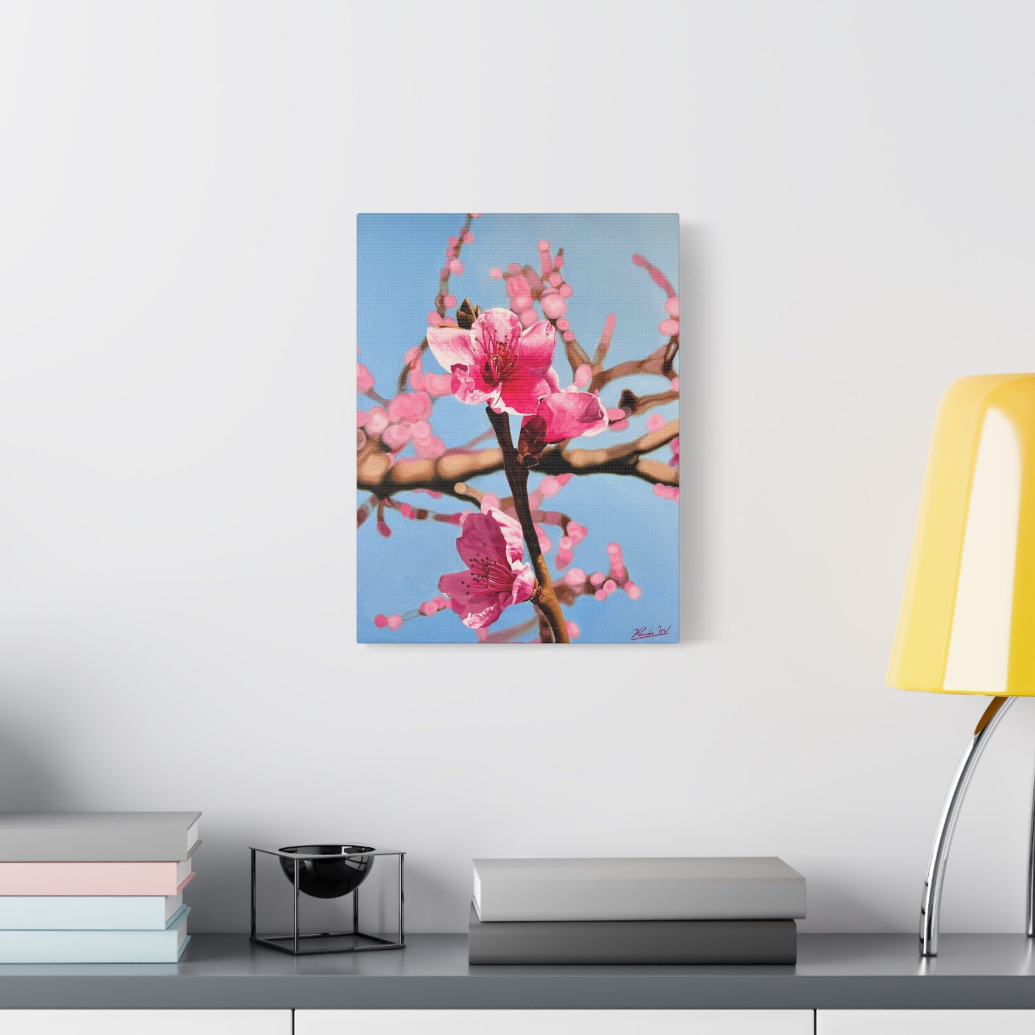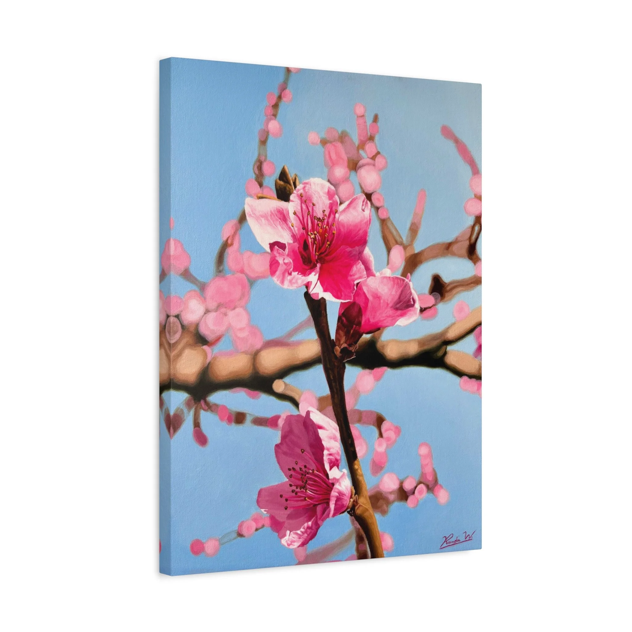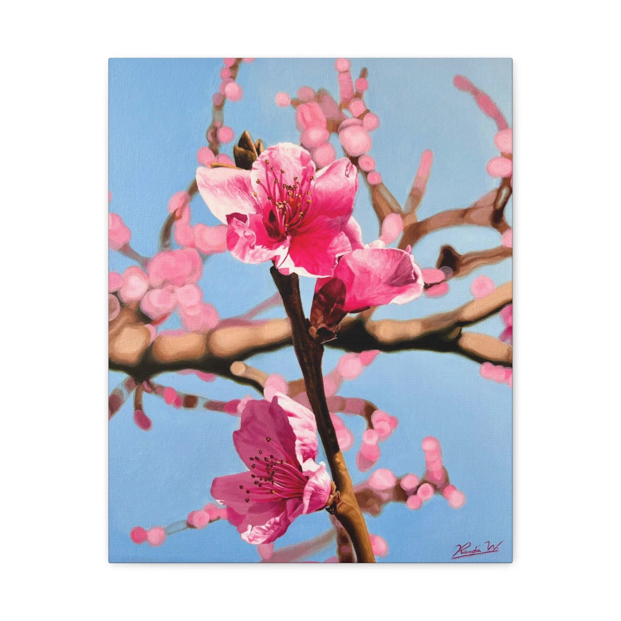 A matte stretched canvas featuring a close-up of vibrant pink blossoms against a clear blue sky. The soft, painterly style brings a calm, optimistic energy to a room—like a quiet morning spent beneath flowering branches. Lightweight yet substantial, the 1.25" profile adds presence on the wall without overwhelming the space. Hang it in a reading nook, entryway, or sunlit bedroom to invite a gentle, nature-filled pause into everyday life.